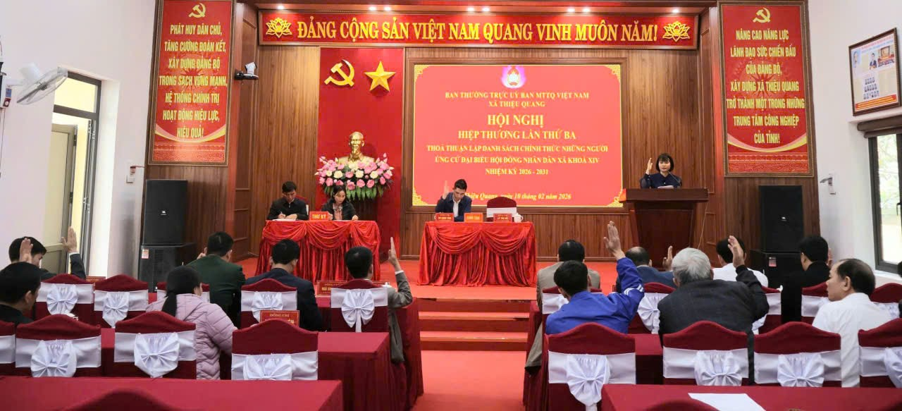 Chiều ngày 10/2, Ban Thường trực Ủy ban MTTQ Việt Nam xã Thiệu Quang tổ chức Hội nghị hiệp thương lần thứ ba nhằm thỏa thuận, lập danh sách những người đủ tiêu chuẩn ứng cử đại biểu HĐND xã Thiệu Quang khóa XIV, nhiệm kỳ 2026–2031.